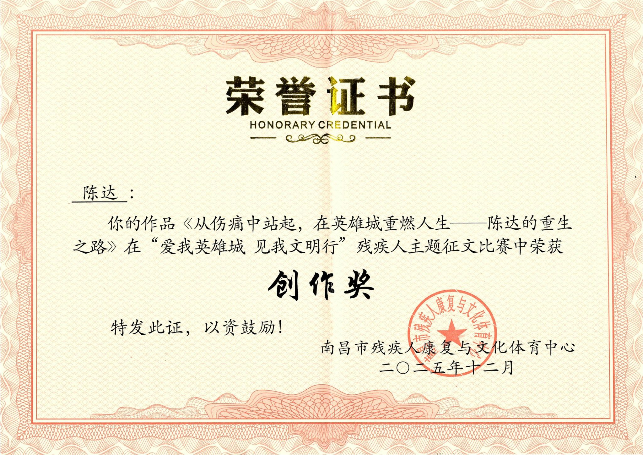 近日,由南昌日报、洪观新闻、文明南昌、南昌市残疾人联合会联合开展的“爱我英雄城 见我文明行”残疾人主题征文获奖篇目揭晓,我校后勤保障处职工陈达的作品《从伤痛中站起,在英雄城重燃人生——陈达的重生之路》荣获创作奖,也体现了学校对残疾人员工的关怀与支持。(文/图 刘芳芳 责任编辑/张惠 潘旭)