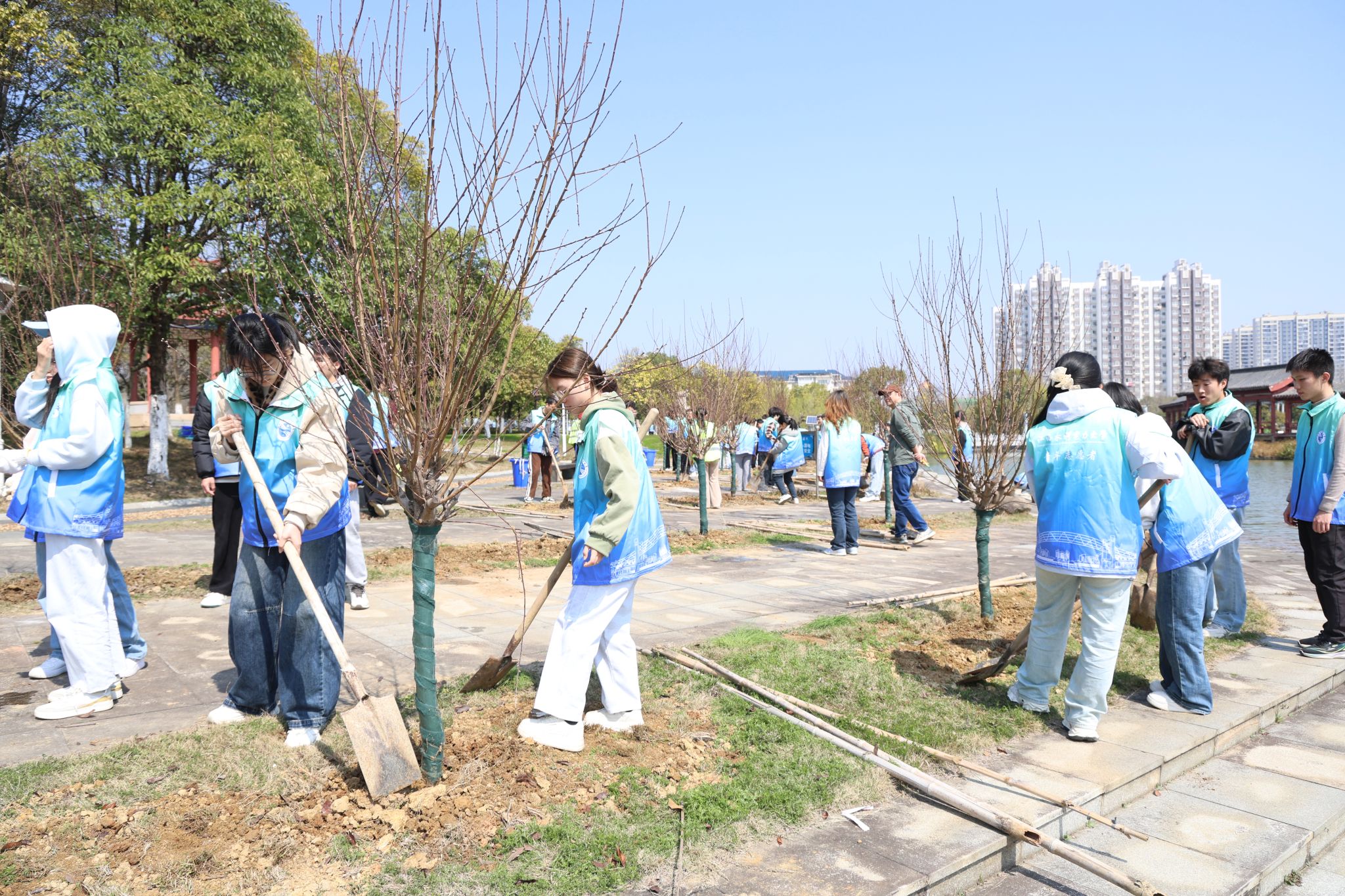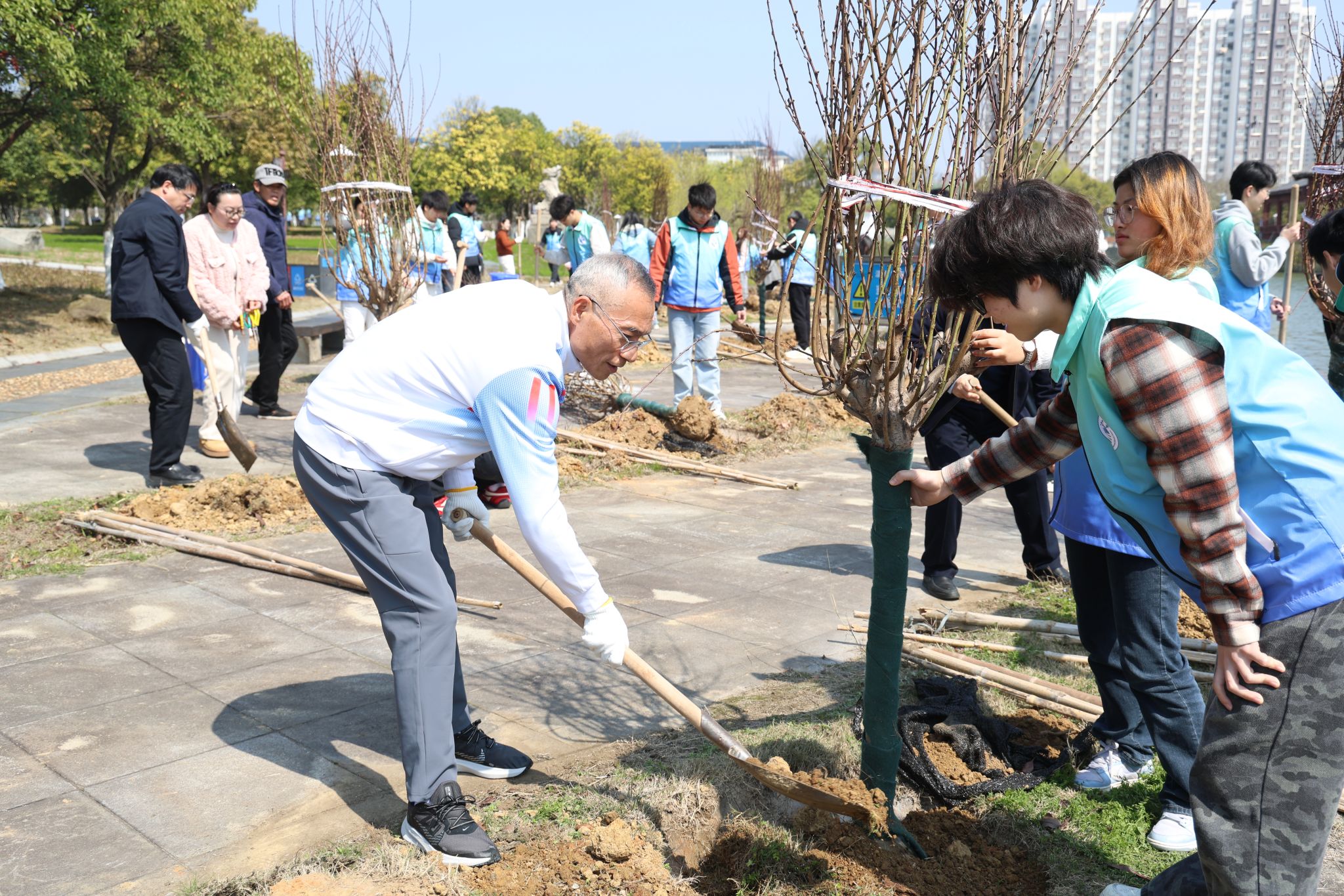 植树现场,校领导与师生分组协作、配合默契,挥锹铲土、扶苗围堰、提水浇灌,认真细致完成每一道工序。春风拂过,一株株新植树苗迎风挺立,生机盎然,为校园增添了一道亮丽的风景。